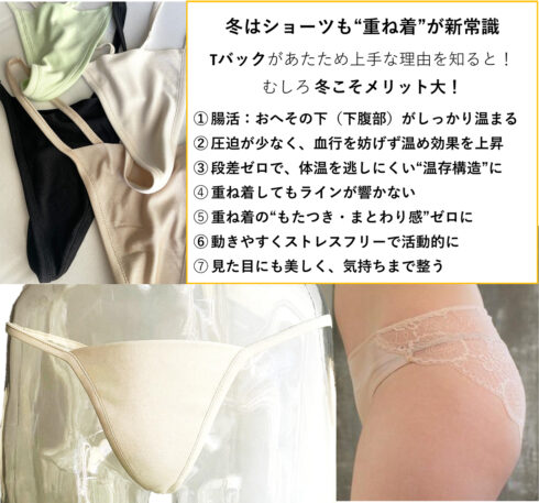 Tバックが実はあたため上手な理由** 寒くなるとレギンスやタイツは重ねるのに、 「ショーツ」はつい一年中おなじ…という方は少なくありません❣ でも実は、下半身のあたたかさは“ショーツ選び”でも大きく変わります。 特に、冬の重ね着に“実は相性が良い”のが Tバック。 「え、冬にTバック?」と思われるかもしれませんが、 理由を知るとむしろ 冬こそメリット大 なんです。 ■ 1. Tバックは“重ね着レギンス”と相性がいい レギンスやタイツを履くとき、 ・ショーツのゴロつき ・縫い目の段差 ・ヒップの生地のたるみ がストレスになることがあります。 Tバックは 後ろに生地が重ならないので、段差ゼロでスッキリ。 レギンスがきれいに沿い、 脚のラインまで美しく見せてくれます。 ■ 2. 圧迫が少ない=お腹まわりの“冷え対策”にも 一般的なショーツは ヒップを包む生地が腰まわりを引き下げ、 ウエスト〜下腹部を締め付けがち。 Tバックは 包む生地が少ないため、 腸や骨盤まわりへの圧迫が軽減されます。 実は、腸の多くは おへそを中心にぐるっと広く分布しており、 その下を冷やすと全身の巡りにも影響します。 締め付けを減らすTバックは、 結果的にあたため効果を邪魔しないインナーなんです。 ■ 3. 上から“温活ショーツ”を重ねて最強に 冬の下腹部ケアにおすすめなのは **Tバック × 温活ショーツ(またはシルクショーツ)**の重ね着。 理由は2つ。 1)Tバックは段差が出ないので重ね着に向いている 2)肌側をシルクにすると温度・湿度調整であたたかい 肌への刺激も少なく、 一日中ほんのりポカポカ。 ■ 4. Tバックでも痛くならない選び方 Tバックの懸念は 「食い込みそう」「痛そう」。 でも、正しく選べば問題ナシ。 ❶後中心が細いもの(太いと中心で折目や丸まり厚みが出て硬い込みになります) ❷ウエストが腰骨ラインに沿うもの ❸脇幅が細くソフトなタイプ ➍生地はピュアシルクがベスト or 柔らかい素材 これだけで、 **違和感のない“冬向けTバック”**になります。 ■ 5. レギンス愛用者にとっては特にメリット大 レギンスのフィット感を損なわず、 ヒップラインが響かず、 お腹を圧迫しない。 つまり、 レギンス × Tバック は 実は “冬の最強コンビ”。 レギンス愛用者さんにはぜひ試してほしい組み合わせです。 <まとめ> 冬のTバックは「冷えやすい」ではなく「温めを邪魔しない」選択。 段差ゼロでレギンスがきれい 腰まわりの圧迫が少ない シルクショーツの重ね着でポカポカ 腸・骨盤まわりを平らに保つ あたため重視の冬こそ、 Tバックの意外な実力が光ります。